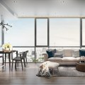 Above: Floor-to-ceiling glass windows provide an unobstructed view of the city skyline